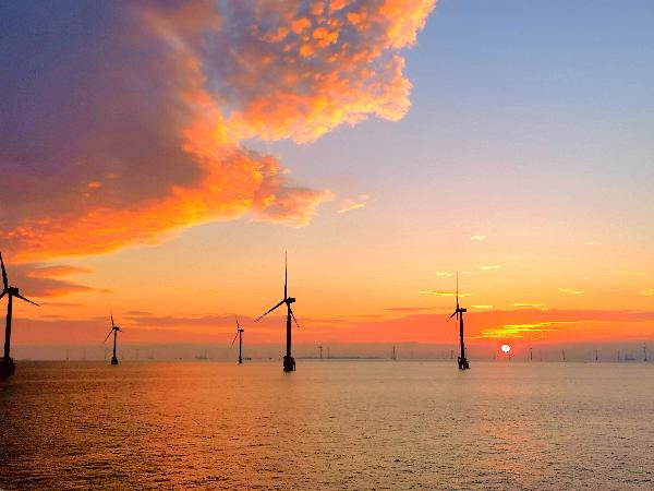 傍晚时分的海上风机